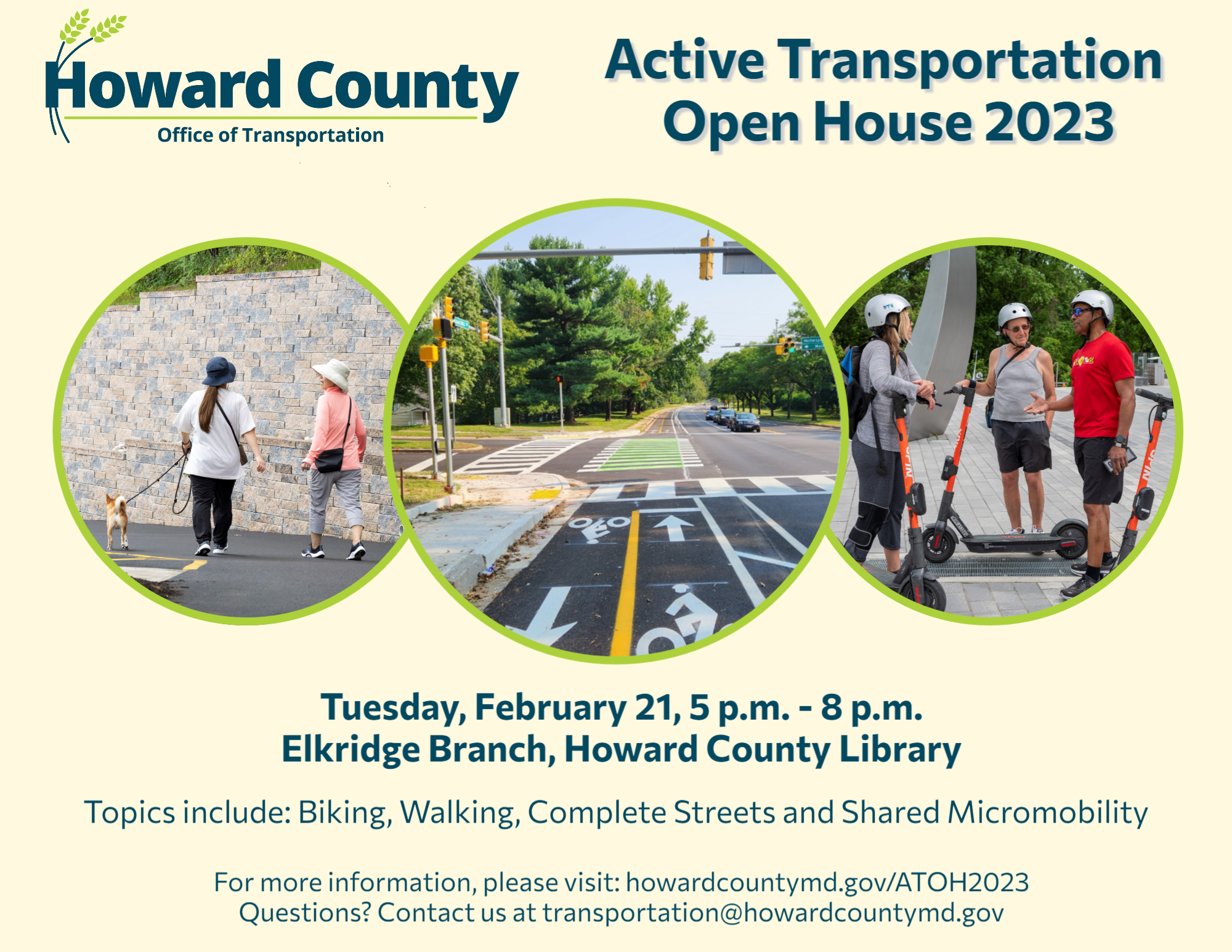 2023 Active Transportation Open House The Active Transportation Open House will be held February 21, 2023 at Elkridge Library from 5pm to 8pm. More details here. Share this: Click to share on X (Opens in new window) X Click to share on Facebook (Opens in new window) Facebook Like Loading...